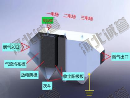 荷電粉塵的捕集過程:在兩個(gè)曲率半徑相差較大的金屬陽極和陰極上,通過高壓直流電,維持一個(gè)足以使氣體電離的電場(chǎng),氣體電離后所產(chǎn)生的電子:陰離子和陽離子,吸附在通過電場(chǎng)的粉塵上,使粉塵獲得電荷。荷電極性不同的粉塵在電場(chǎng)力的作用下,分別向不同極性的電極運(yùn)動(dòng),沉積在電極上,而達(dá)到粉塵和氣體分離的目的。