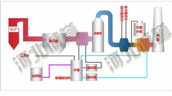 在MGGH基礎(chǔ)之上,在脫硫塔出口增設(shè)煙氣冷凝系統(tǒng)對煙氣直接降溫,使飽和煙氣中水蒸汽冷凝并在煙道中捕集下來,收集的冷凝水,進(jìn)行簡單處理后即可進(jìn)入FGD系統(tǒng)使用。冷源:江、河、湖、海水等自然冷源,循環(huán)冷卻水,強制通風(fēng)冷卻塔。